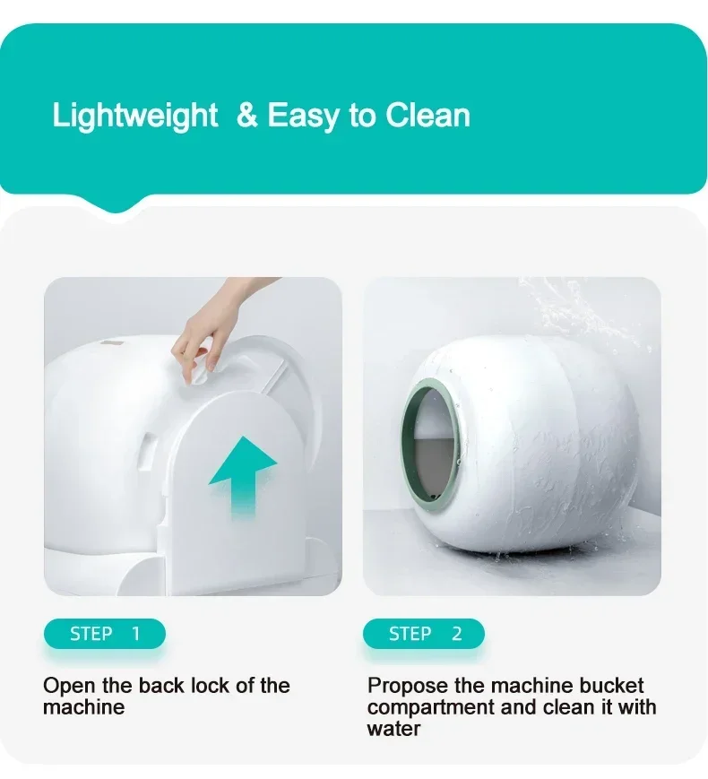 1. Smart Cleaning self cleaning litter box has automatic cleaning modes, you can watch the cat litter box clean itself versus fighting the dust. The one-click cat litter replace function can empty the old litter at one time, no more scooping! Truly free your hands. 2. Innovative Deodorization Technology self cleaning cat litter box adopts innovative electronics Ionic deodorizer, which is safe and non-toxic, no need to replace any consumables. The Ionic deodorizer will start working after your cat has finished pooping, reducing odor emissions into the room. 3. Low Maintenance automatic cat litter box is big enough for up to 3 adult cats. Worry free of replacing cat litter frequently, excellent for anyone who is busy. Cleaning automatic litter box is effortless, it only comes in two parts, pretty easy to assemble and disassemble, and you can flush the litter cylinder. Note that the base should not get wet.