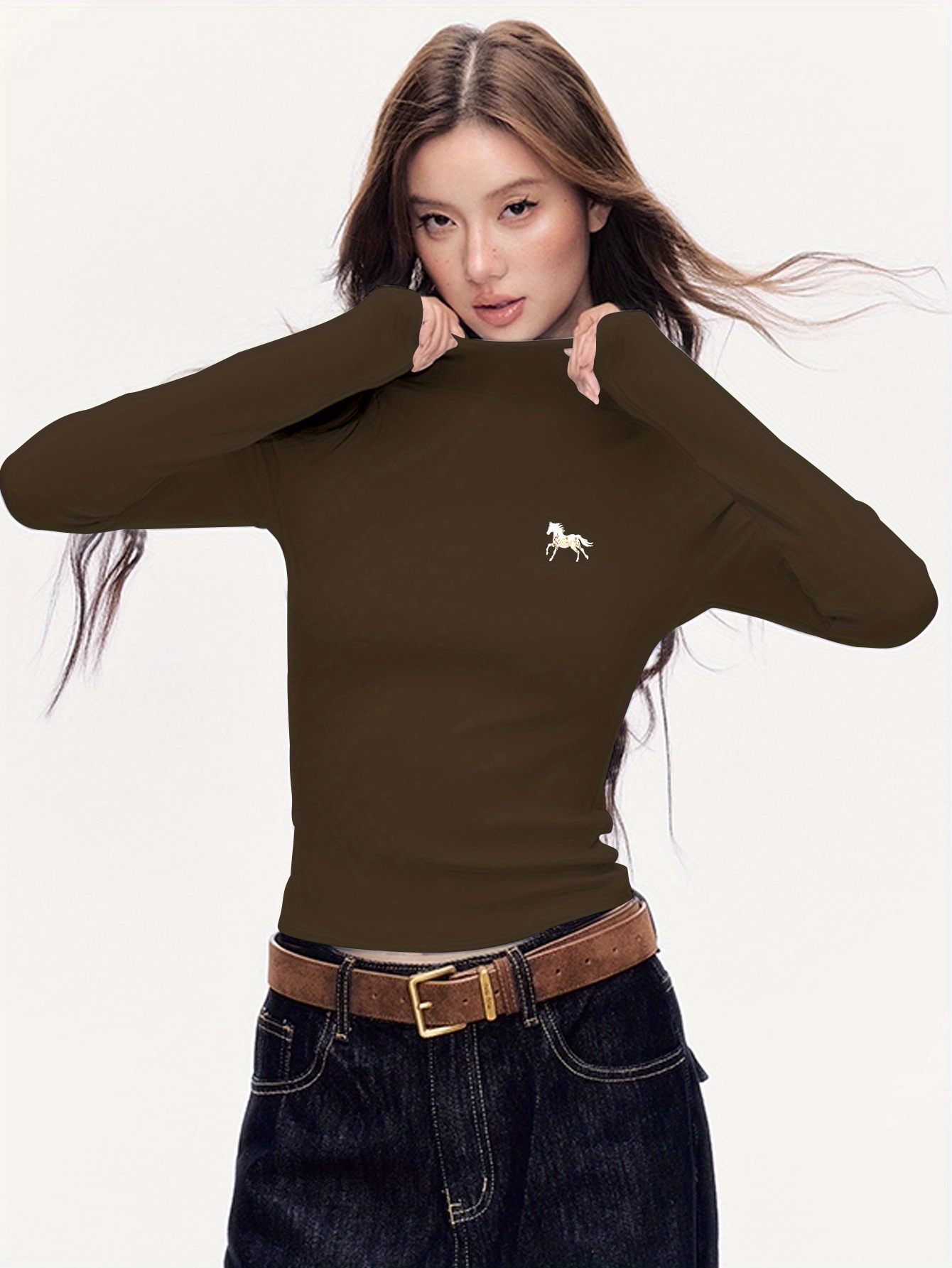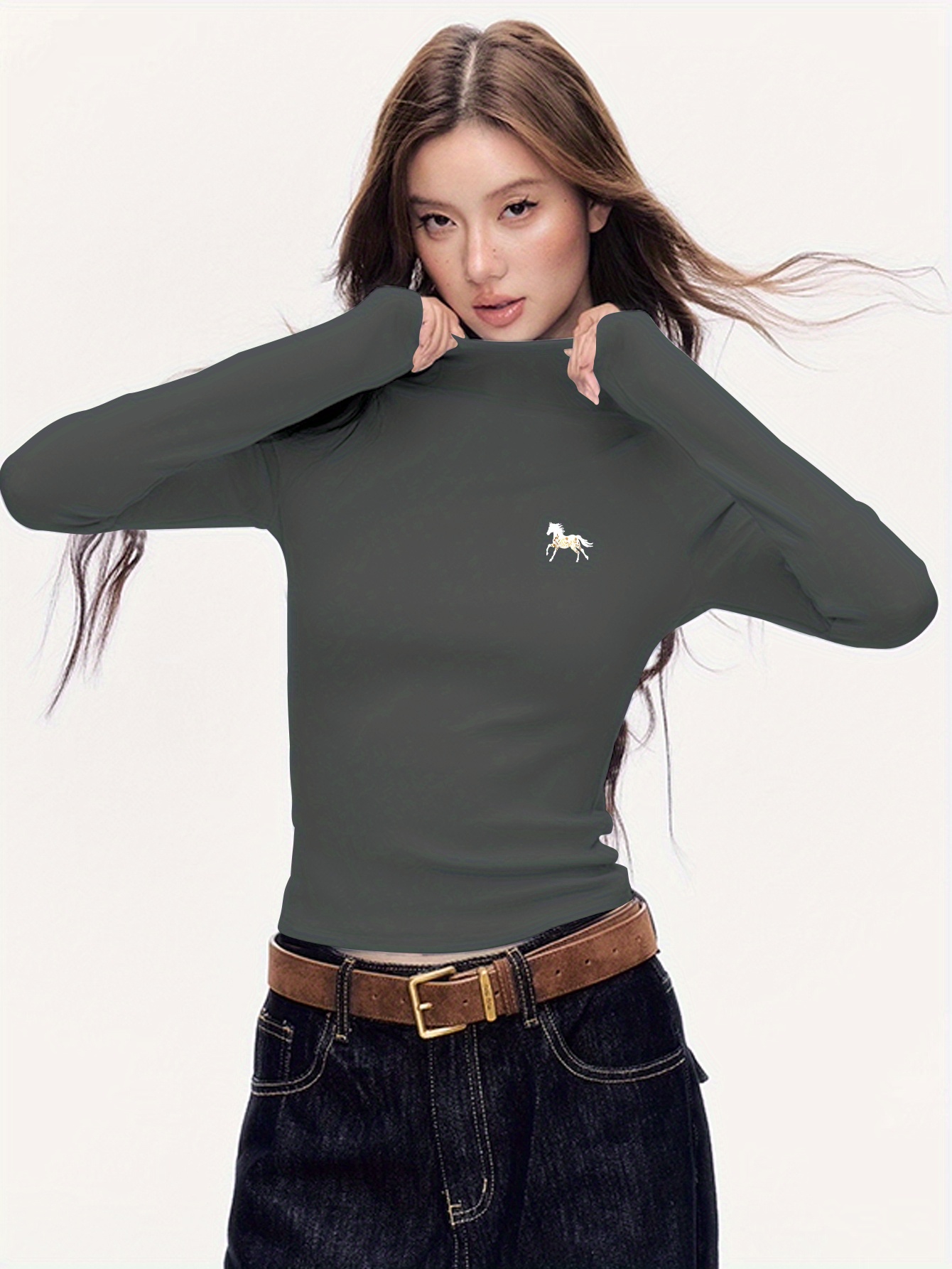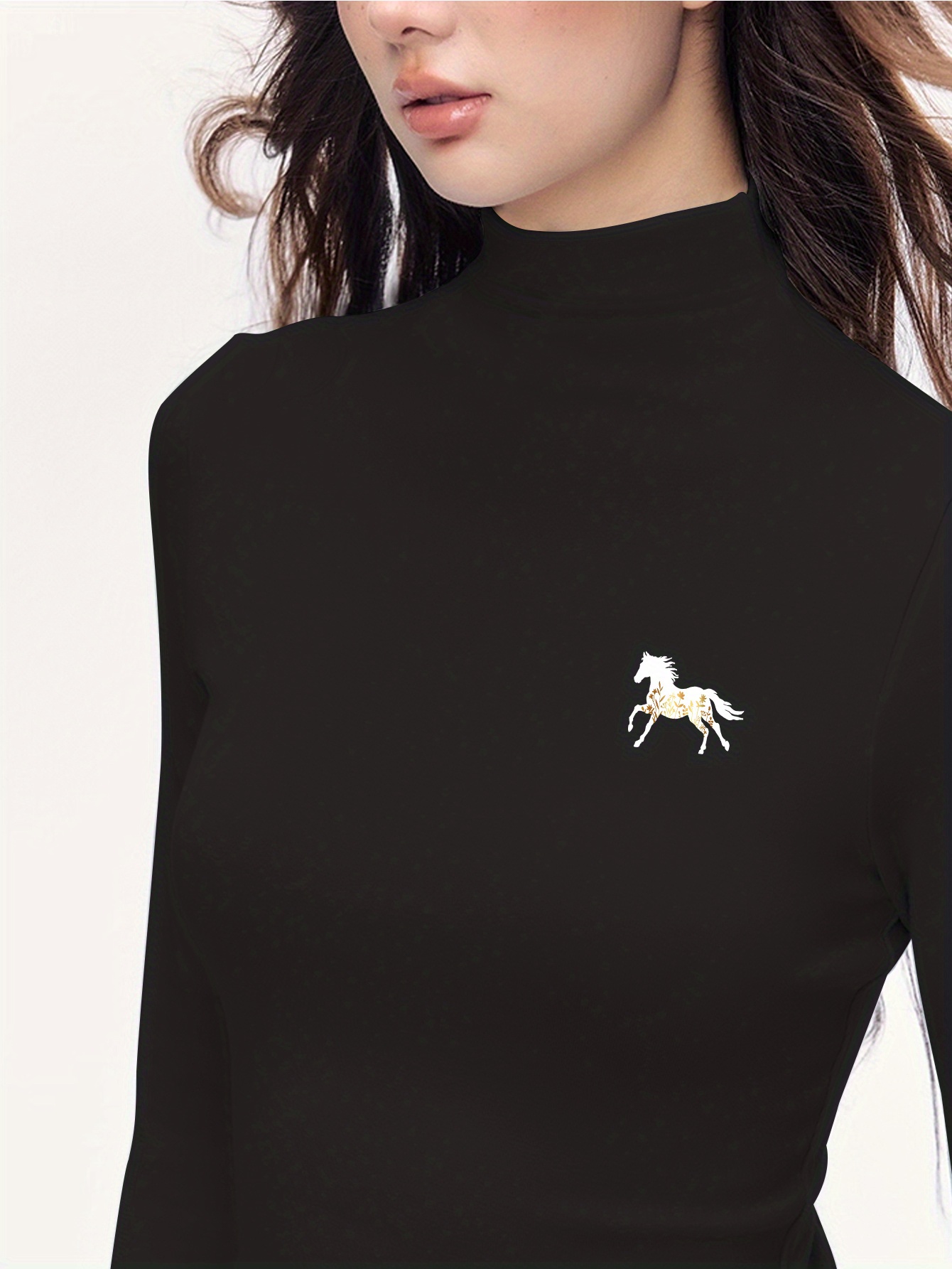 Women'S Elegant Half-Turtleneck Long Sleeve T-Shirt - Soft Fleece-Like Fabric, Black with White Horse Silhouette & Golden Accents, Machine Washable, Versatile Casual & Formal Wear, Winter Warmth, 2025 Autumn Winter Essential,