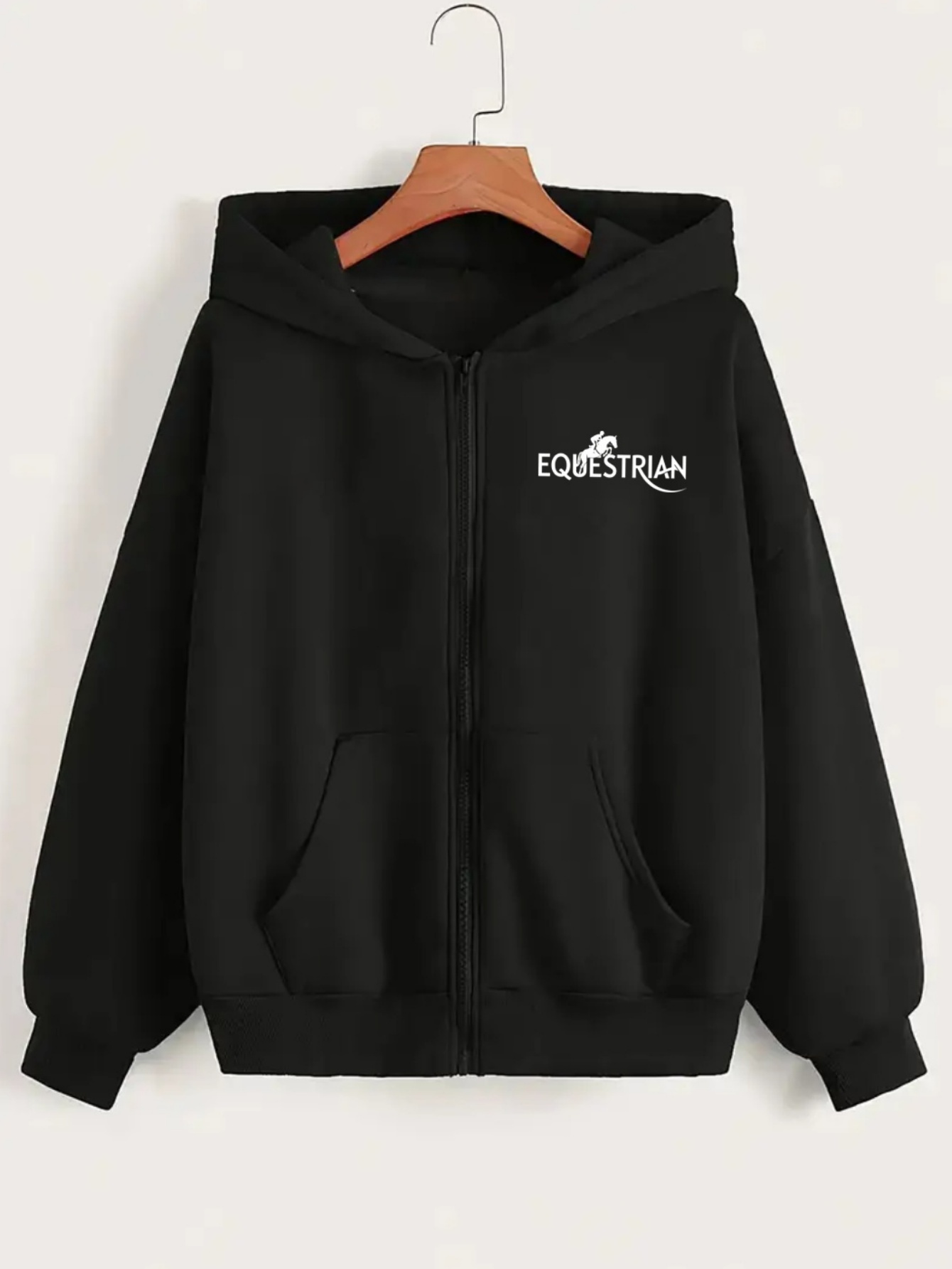 Women's Equestrian Print Hooded Zip-Up Jacket - Horse Head & Lettering Design, All-Season Casual Sportswear Coat, Machine Washable Relaxed Fit Outerwear for Horseback Riding & Everyday Use